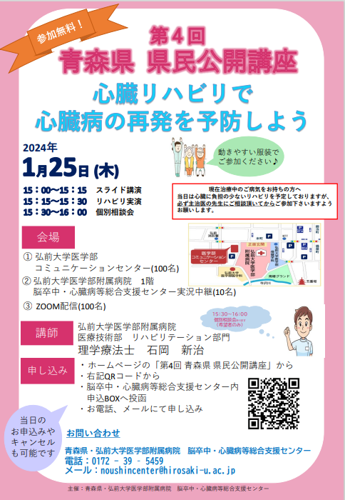 ①「心臓リハビリで心臓病の再発を予防しよう」 講師:弘前大学医学部附属病院 医療技術部 リハビリテーション部門 理学療法士 石岡 新治